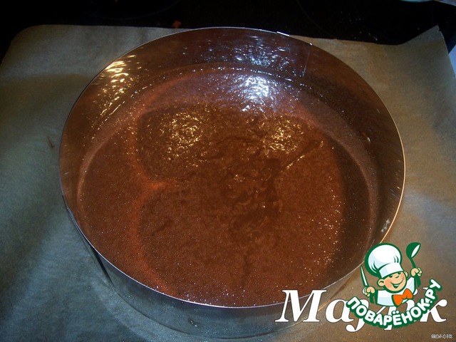 Выложить шоколадную массу на слегка остывший ореховый корж и отправить в разогретую до 160 градусов духовку на 30 минут.