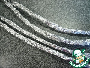 Тем временем готовим шампуры из веток деревьев. У меня в этот раз были только коротенькие сухие веточки. Пришлось хорошо вымыть, очистить от коры, намотать фольгу. Если хорошие свежие ветки, не нужно предпринимать таких осторожностей. -