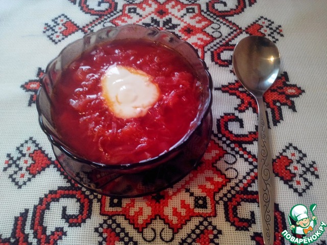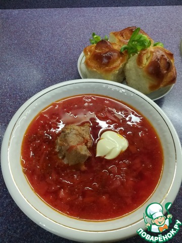 У каждой хозяйки, конечно, есть свой рецепт приготовления борща. Мне хотелось бы поделиться с вами одним из своих рецептов. Может быть вам понравится и вы им воспользуетесь. Насыщенный цвет и вкус. К этому борщику ещe чeрный хлебушек, чесночок и ложечку сметаны. М-м-м... вкусно.