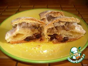 На середину положить начинку: 1 ч. ложку изюма, рядом 1 ч. ложку орешков и сверху 1 ч. ложку безе.