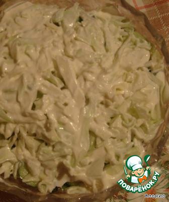 Мелко нарезанная и перетертая с солью для сочности капуста. Смазываем ее заправкой, последним слоем будет вновь лук. |