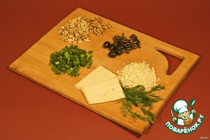 Брынзу натереть на терке, зеленый лук и укроп мелко нарезать, грецкие орехи измельчить, маслины нарезать соломкой. Все вместе смешать и заправить оливковым маслом, специями.