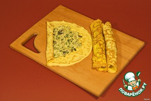 На омлет равномерным слоем накладываем начинку и сворачиваем тугой рулет.