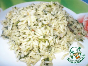 порезанный лук обжарить на растительном масле до золотистого цвета и добавить мелко порезанный шпинат,и обжарить пару минут,добавить рис и обжарить минуту,после переложить все в кастрюльку залить водой,посолить,поперчить добавить лаврушку и готовить до готовности!