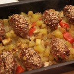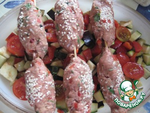 сверху - шпажки с кёфтами, и жарим в духовке 220-240°C около 20-30 мин. -