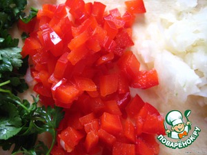 Очень мелко нарезаем лук, сладкий перец, зелень...