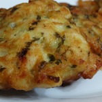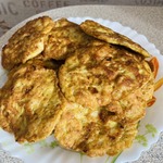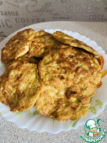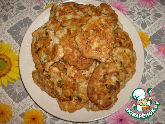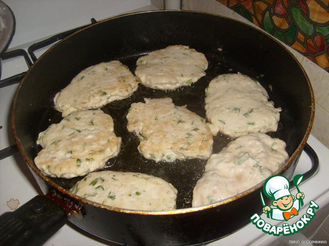 Выкладывать полученную массу ст. ложкой, как оладьи, на раскаленную сковороду с растительным маслом.