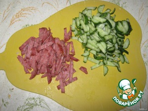 Нарезаю полосками огурцы и колбаску.