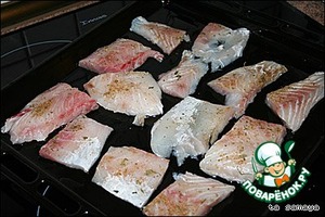 Нарезанные на крупные куски филе окуня раскладываем на противень (не забыв посолить).