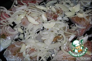 Режем кольцами лук и раскладываем равномерно вторым слоем.