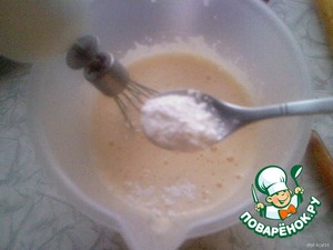 Теперь добавляем по одной ложке муку, постоянно перемешивая, крахмал. Сейчас можно добавить воду и снова хорошенько перемешать.