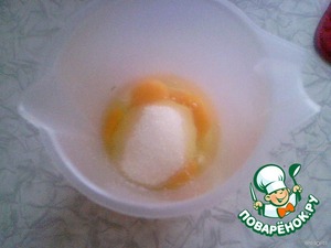 А теперь бисквит: Вбиваем яйца, добавляем сахар и ванильный сахар, перемешиваем,чтобы смесь увеличилась вдвое. -