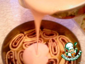 В 4 столовых ложках молока разводим содержимое пакетика, добавляем сахар и хорошо перемешиваем. Ставим оставшееся молоко на огонь и доводим до кипения, снимаем с огня. Постепенно вливая растворённый пудинг, перемешиваем смесь. Снова ставим на огонь, доводим до кипения и варим, постоянно помешивая, ещё 1 минуту. Снимаем с огня и остужаем. Достаём из духовки готовый бисквитный пласт и остужаем.