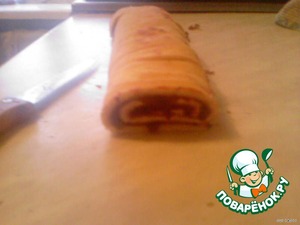 • На бисквитный пласт выкладываем варенье и сворачиваем в рулет. Разрезаем рулет на 12 кусочков.