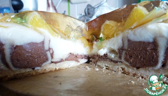 Вот мой разрезик. Торт делаю не первый раз, разрезы всегда разные и интересные. Сам торт очень вкусный. Особенно нравится нижний песочный слой. Пудинг в пакетиках не покупаем никогда, делаю сама. Верхний слой научилась заливать так, чтоб он не убегал. 1) всё обматываю пищевой плёнкой и снаружи и изнутри 2) заливаю желе уже когда оно остыло и хочет схватиться, то есть уже немножко густое. Спасибо автору! Буду делать ещё не раз. Да, кстати, просто так, без повода. Потому что любим сладкое к чаю.
