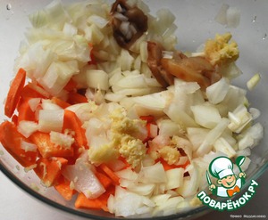 Морковь, лук, шампиньоны нарезать, выдавить чеснок. Выложить в сковороду, где жарилось мясо.