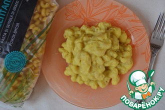 Соединить соус с пастой, посыпать 1/2 частью тертого пармезана, быстро перемешать и сразу подавать к столу. При подаче на стол (при желании) посыпать еще сыром.
