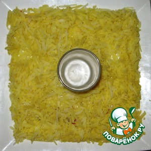 Отварной в мундире картофель потереть на крупной терке и выложить на блюдо.