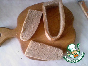Берём хлеб (можно и батон - желательно по-толще, чтобы яйцо сверху не выливалось). Вырезаем в нём средину и разрезаем её вдоль пополам.