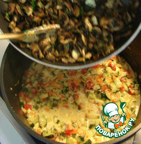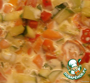Обжарить лук в 3 ст. л. растительного масла до золотистого цвета и добавить к нему все овощи, порезанные маленькими кубиками, по степени их твердости: морковь, сельдерей, цуккини, болгарский перец, помидоры. Постоянно помешивать, чтобы не пригорели. Добавить крупно нарезанный чеснок. Посолить, добавить приправы по вкусу (перец белый молотый например).