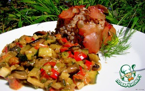 Гречневую кашу поставить варить одновременно с началом обработки овощей. Заранее прогреть духовку. Когда каша практически готова, переложить ее в открытую огнеупорную посуду и поставить в духовку немного подсушить (по желанию). Достать, порционно заполнить форму (чашку), утрамбовать и перевернуть на тарелку. Повторить по количеству едоков. Добавить маленький кусочек сливочного масла в верхушку каждой порции.