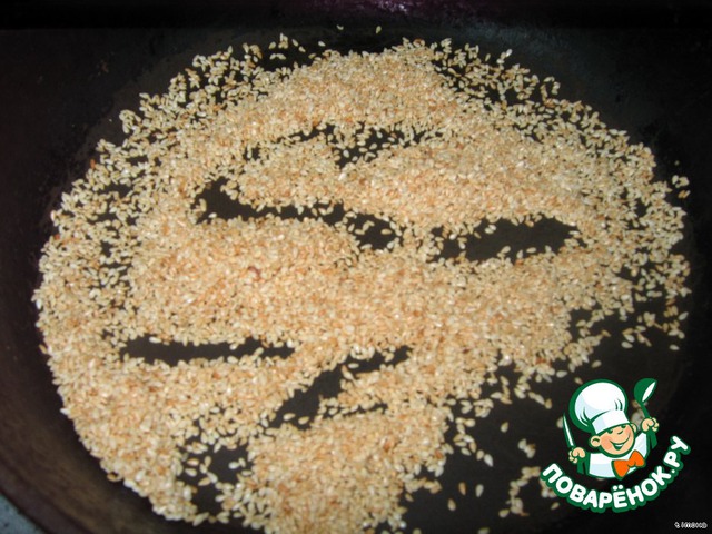 Кунжут обжарить, постоянно помешивая, до золотистого цвета.
