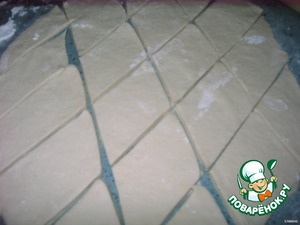 Раскатать тесто толщиной в 0,8 см и разрезать на ромбики (или по желанию).