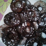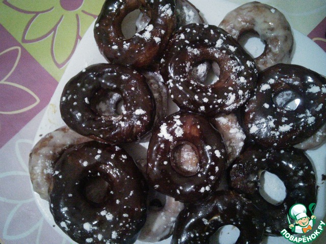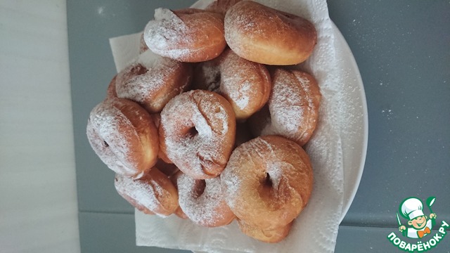 Как поднялось, осторожно выкладываем на стол, отрезаем кусочки и, заворачивая края кусочков в середину, формируем круглые пончики с дырочкой посередине.