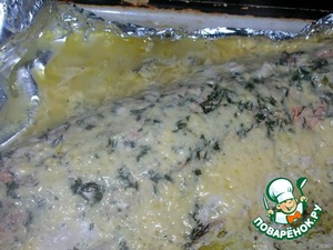 Взять филе горбуши и выложить на фольгу. На кусочки не режу (только не смейтесь!) чтоб не пачкать руки, готовую по-моему удобнее и приятнее делить на порции. Посолить, поперчить, залить кефиром. Посыпать нарезанным укропом (не жалейте, будет очень ароматно!) и тёртым сыром. Завернуть фольгу и запекать 30 минут.