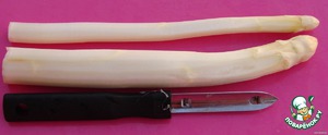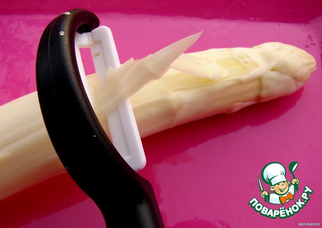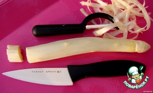 Чистят спаржу овощечисткой, отступив чуть больше см от почки. Чистят тщательно, так как верхний слой, после варки становится твердым, как кора.