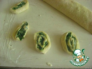 Скатываем тесто в тугой рулетик и нарезаем острым ножом куски толщиной в 1-1,5 см. Каждый кусочек нужно слегка приплюснуть руками.
