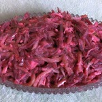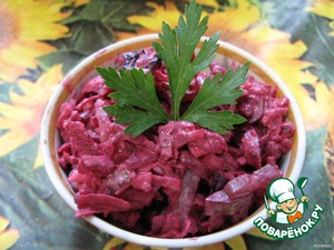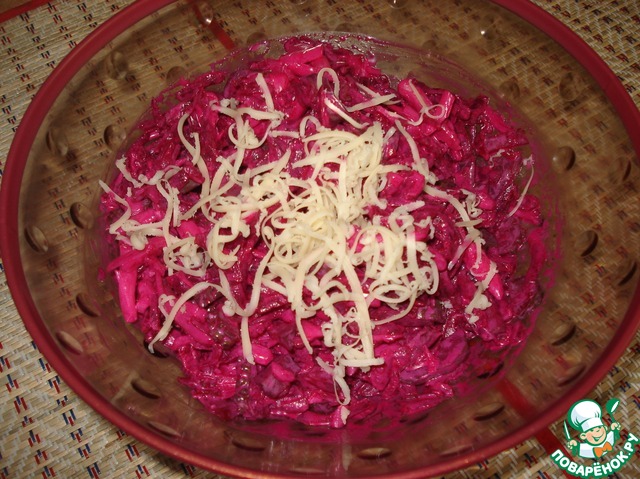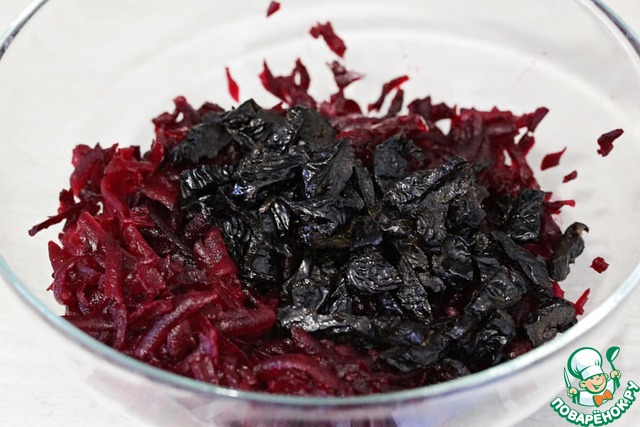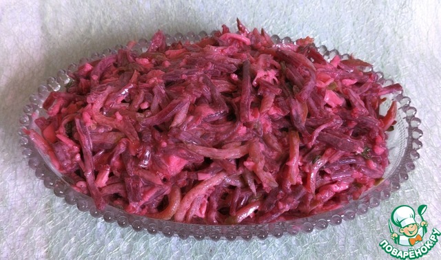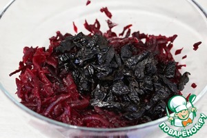 Натереть свёклу на крупной тёрке, выложить в салатник.