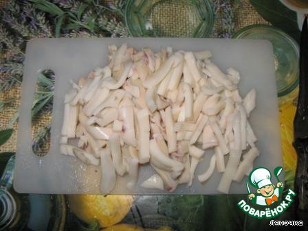Кальмары порезать соломкой. У меня были уже отваренные и почищенные.