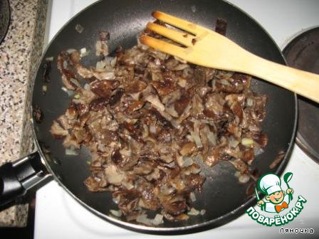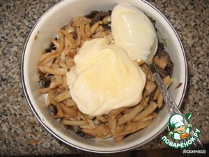 Соединить кальмары с грибами, заправить сметаной или майонезом. Можно ничем не заправлять, т.к. в них есть масло от обжаривания.