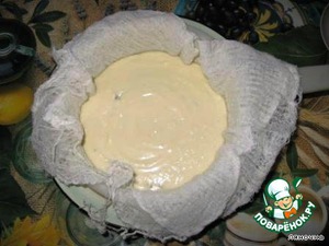 Тонкую плотную ткань смочить водой и выстлать дуршлаг или пасочницу. Выложить туда творожную массу.