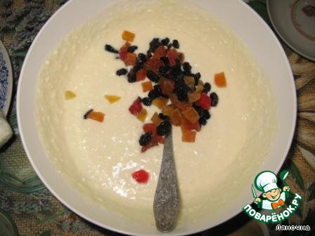 Смешать творог со сметаной, растопленным теплым шоколадом, цукатами и распаренные сухофруктами.