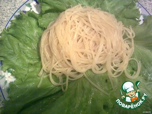 • В кастрюльку с кипящей и подсоленной водой опустить гнезда (у меня Макфа, тонкая и длинная вермишель), сварить по инструкции (у меня это 3 мин.).