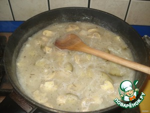 Луковицу нашинковать, припустить в смеси подсолнечного и сливочного масла. Добавить муку, подержать 1-2 минутки, влить тоненькой струйкой рассол. Хорошо перемешать.