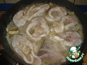Поместить в соус подготовленные кусочки рыбы, встряхнуть, чтоб вся рыба покрылась соусом. Закрыть крышкой и тушить на маленьком огне минут 15.