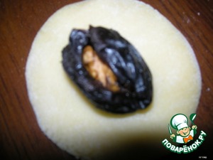 Из теста слепить маленькую лепешечку, в центр положить чернослив. Сформировать шарик размером с грецкий орех. -