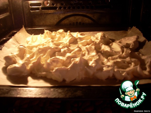 Выстлать пекарской бумагой противень и выложить неровным слоем белки. Чем более неровно - тем красивее. Запекать в разогретой духовке при температуре 150 градусов примерно 50-55 минут. Одновременно поджарить внизу духовки орехи.