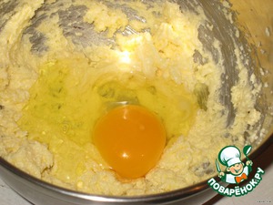 Масло размягчить и взбить с 3 ст.л. обычного сахара и ванилином в белый крем, добавить яйцо и хорошо его вбить в массу.