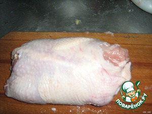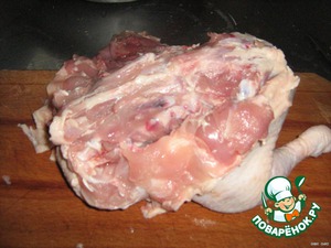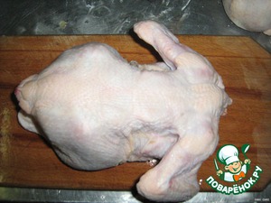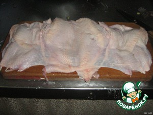 Отрезаем крылья, срезаем огузок, удаляем внутренности, моем. -