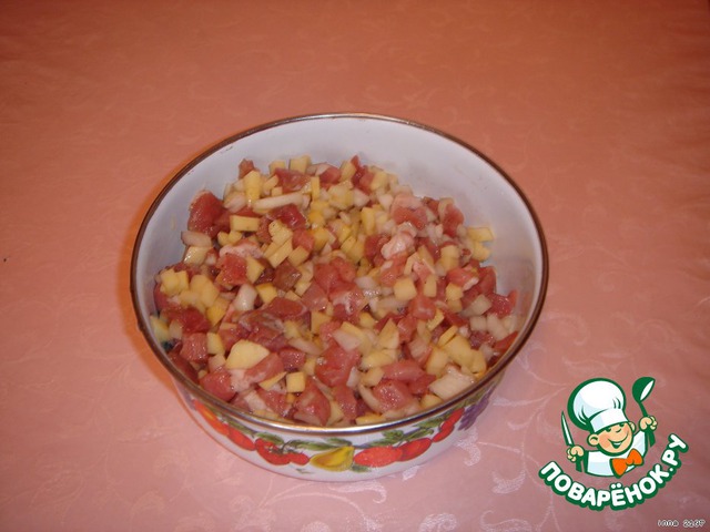 Сырой картофель нарезать мелкими кубиками, также нарезать мясо и лук.