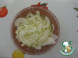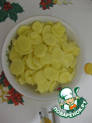 Среднюю картошку нарезать дольками-полукольцами (или полукруглыми пластинками, не знаю, как правильно сказать) по 3-4 мм шириной. Крупную – на 4 части и такими же дольками. Толщина долек важна. Если картошку нарезать толще, она может остаться сыроватой. -