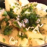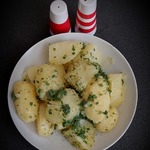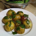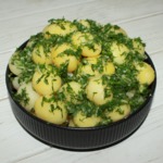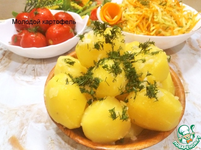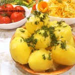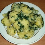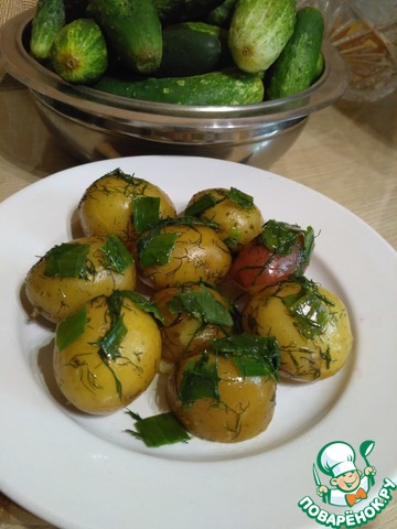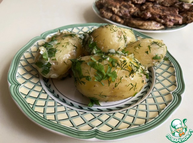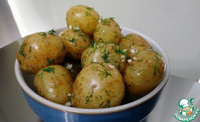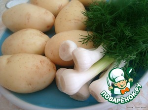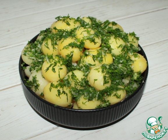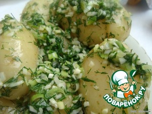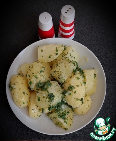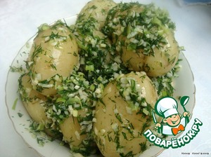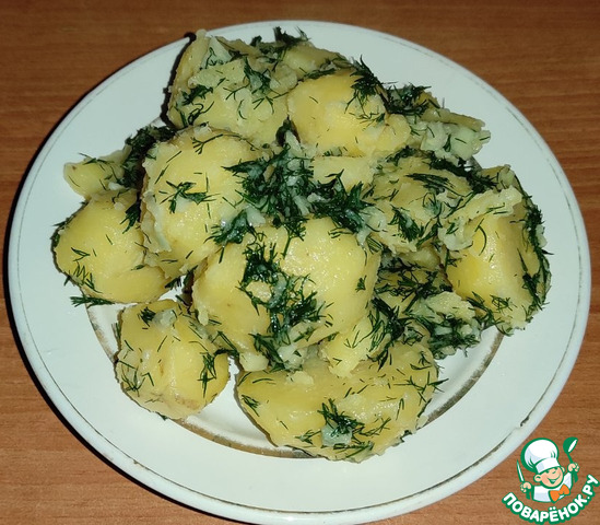 Отварить картофель в подсоленной воде, нарезать мелко чеснок и укроп. С готового картофеля слить воду и засыпать зеленью с чесноком, добавить масло.