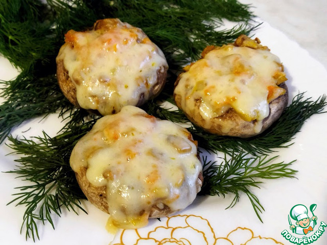 Посолить шапки шампиньонов и нафаршировать начинкой.