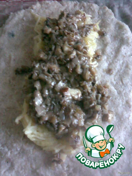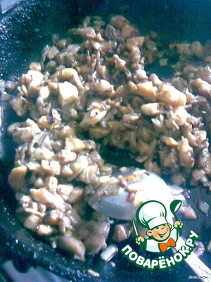 Лук измельчить и обжарить,добавить измельченные грибы+соль,перец.