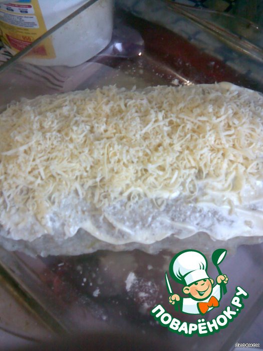 Я не стала заморачиваться и крутить рулет, просто выложила все слоями в форму с фольгой. Вместо майонеза (не было дома) положила для сочности помидоры и посыпала сыром.
