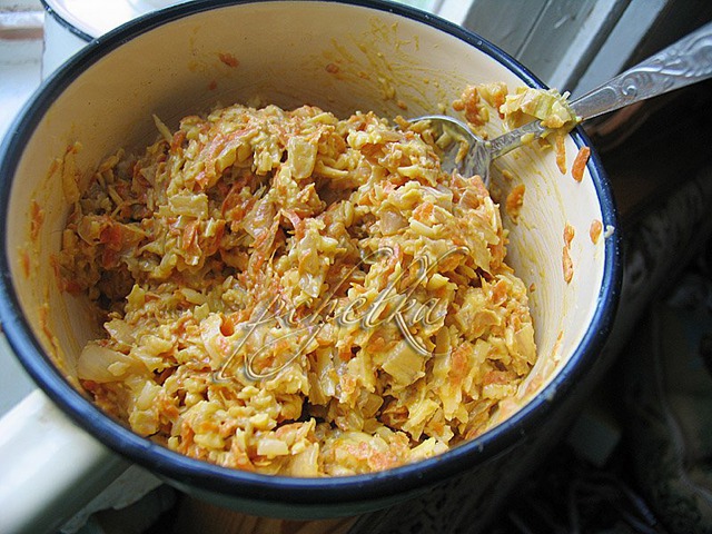 морковь натереть на крупной тёрке, лук мелко порезать и всё обжарить на растит. масле, охладить до тёплого состояния. -